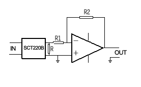 SCT220B是一种精密电流互感器,典型应用电路如图所示。输入额定电流为20A次级(副边)会产生一个20mA的电流。通过运算放大器的作用,用户可以通过调节电阻R、R1、R2的值在输出端得到所要求的电压输出。其中R的值小于10Ω为佳。图中IC为通用运算放大器,如OP07等。由于互感器的动态范围很宽,运算放大器需要有很好的性能。运算放大器的电源电压通常取±15V或±12V,也可根据具体情况自定。图中电阻要求精度优于1%,温度系数优于50PPM.